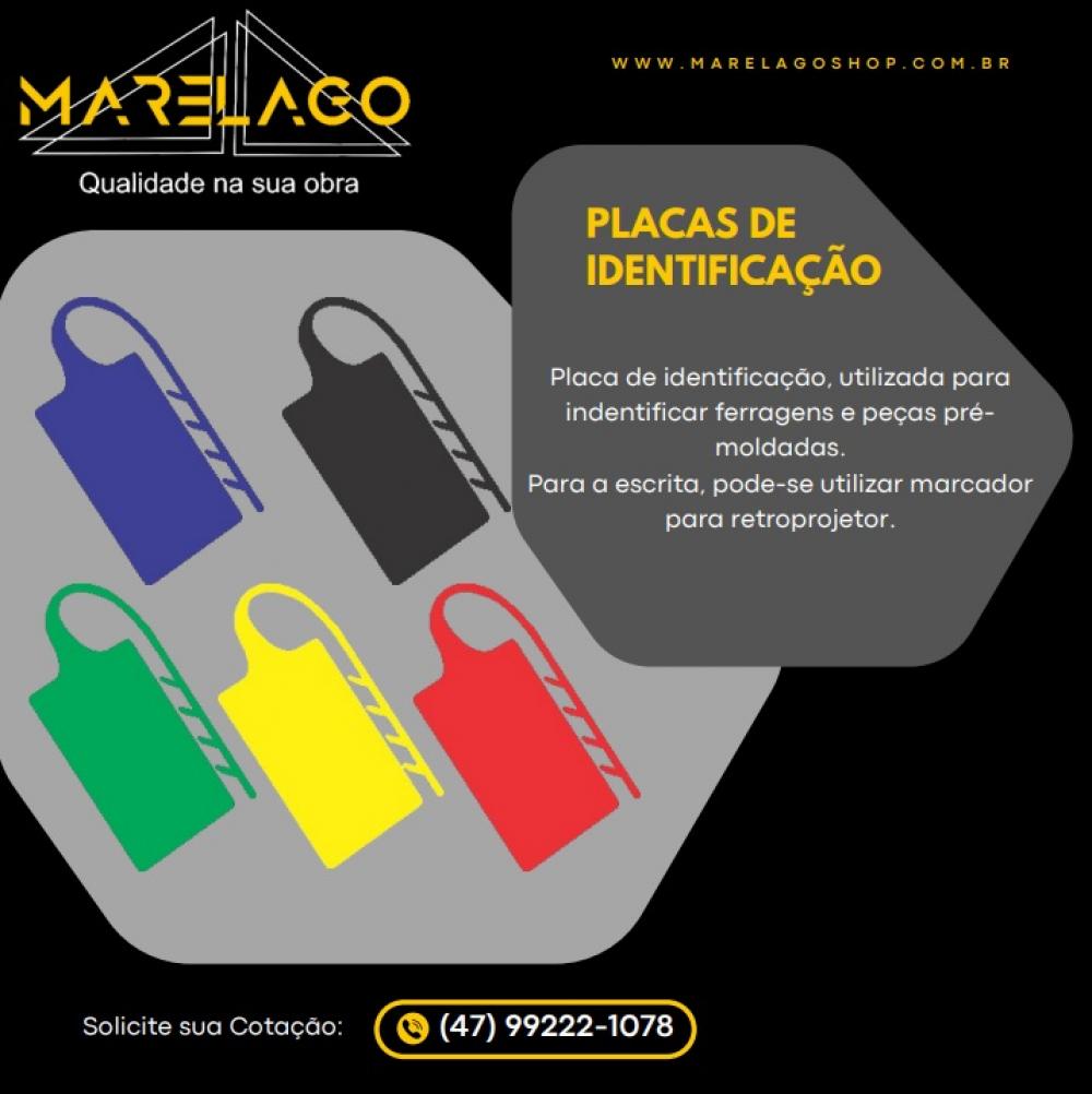Placa de identificação, utilizada para indentificar ferragens e peças pré-moldadas. Para a escrita, pode-se utilizar marcador para retroprojetor. Produto apresentado nas cores: vermelho, amarelo, verde, branco e cinza, que podem ser reaproveitados, de acordo com os cuidados básicos no manuseio.